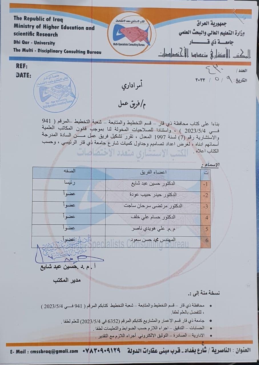 وبناء على توجيه المحافظ، شكل المكتب الاستشاري في جامعة ذي قار، فريق عمل من 6 أعضاء برئاسة الدكتور حسين عبد شايع، لإعداد تصاميم الشارع المذكور.