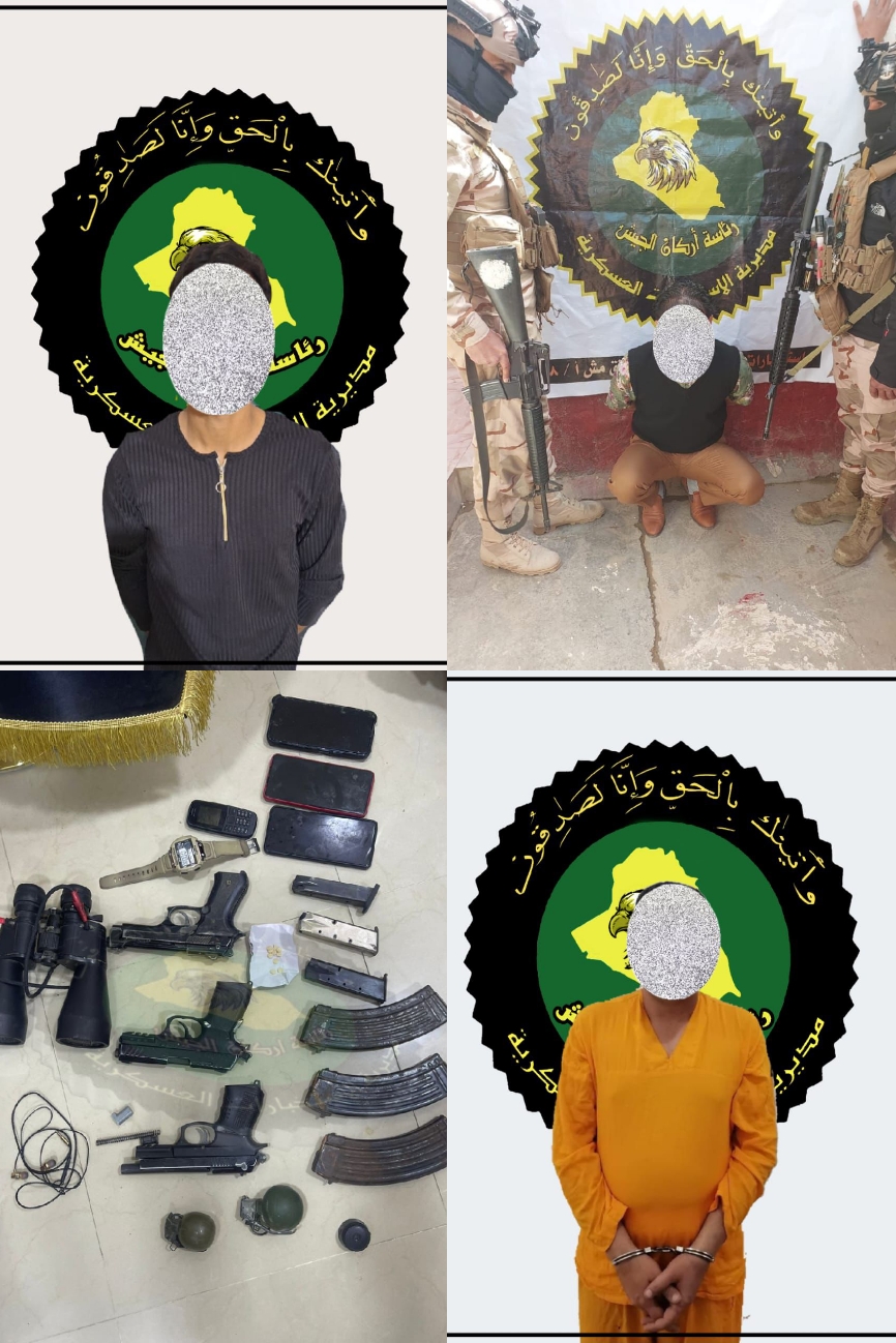 بواجبات منفصلة أستندت إلى معلومات استخبارية دقيقة لشعبتي الفرقة السابعة والثامنة التابعتين إلى مديرية الإستخبارات العسكرية وبالتعاون مع القوات الأمنية الماسكة للأرض ومن خلال كمائن محكمة أسفرت عن إلقاء القبض على ( ٣ ) متهمين مطلوبين للقضاء العراقي وفق أحكام المادة ( ٤ / إرهاب ) في قضائي هيت وعانه وناحية ليلان، حيث كان بحوزة أحدهم على ( ٣ ) مسدس كولومبي محور و ( ٤ ) موبايل ذكي و كمية من الحبوب المخدرة و ( ٢ ) رمانة هجومية و ناظور نهاري و كاميرا مخفية واي فاي، وقد تم تسليم المتهمين والمواد إلى الجهات المعنية حسب السياقات القانونية المعمول بها.