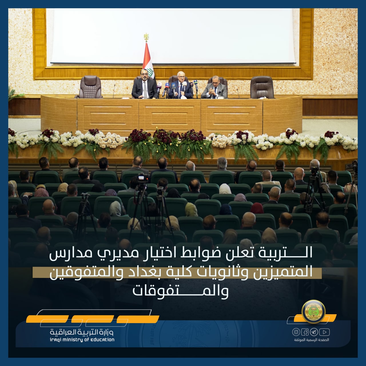 أعلنت وزارة التربية ضوابط اختيار مديري مدارس المتميزين وثانويات كلية بغداد و المتفوقين والمتفوقات للعام الدراسي 2022-2023 .