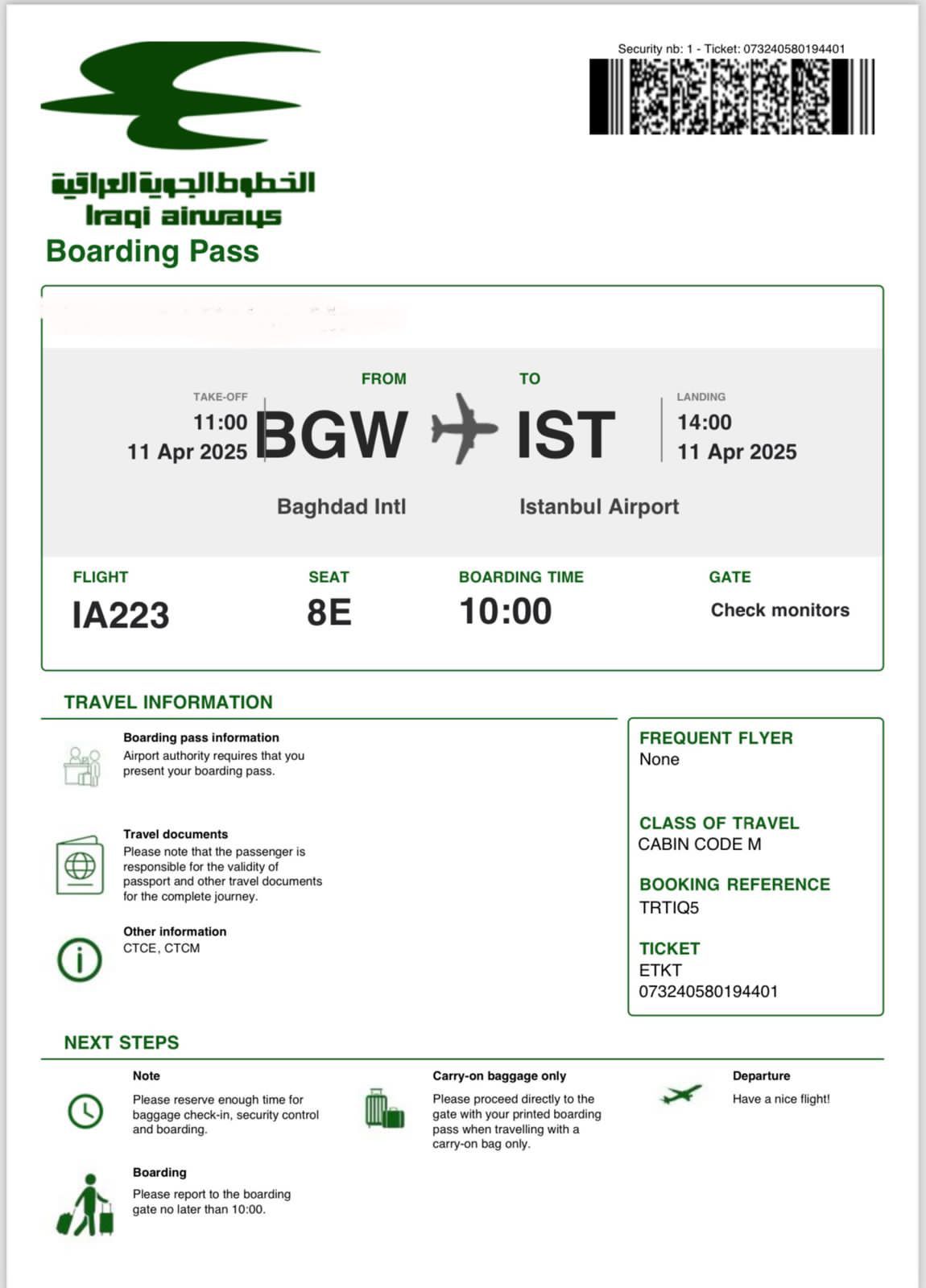 تنفيذاً لتوجيهات معالي وزير النقل الأستاذ رزاق محيبس السعداوي للإرتقاء بمستوى الخدمات المقدمة للمسافرين ومواكبة التطور العالمي في مجال النقل الجوي أعلنت إدارة الخطوط الجوية العراقية عن إطلاق خدمة إصدار بطاقة الصعود إلى الطائرة (Boarding Pass) وتحديد المقعد إلكترونياً عبر التطبيق الرسمي للشركة أو موقعها الحجز الإلكتروني.
