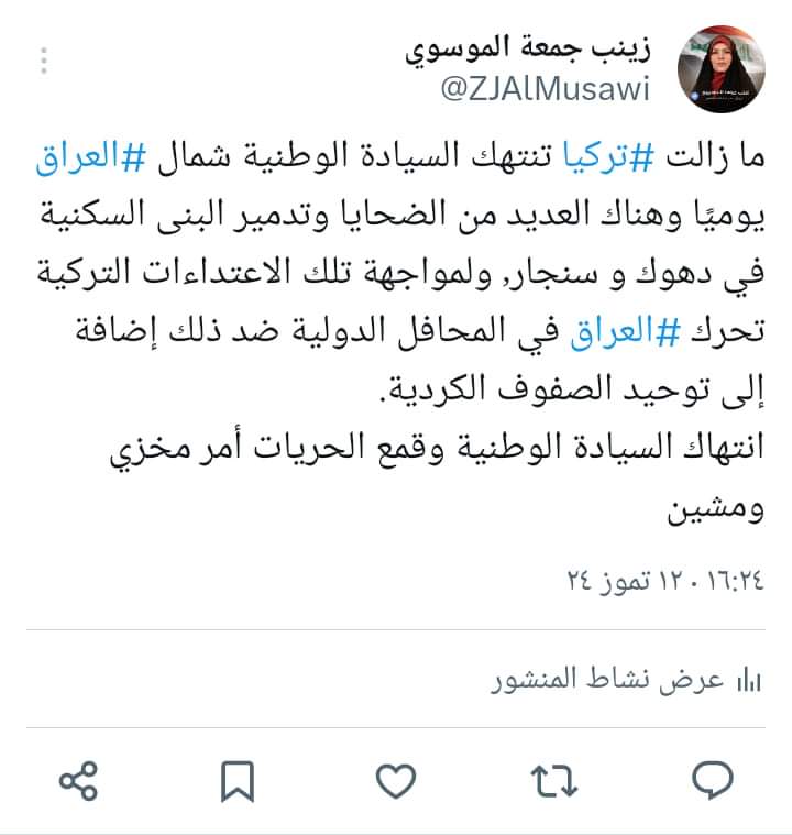 النائبة زينب جمعة الموسوي تدين الاعتداءات التركية على الاراضي العراقية وتصفها بالامر المخزي والمشين بتغريدة لها على منصة X
