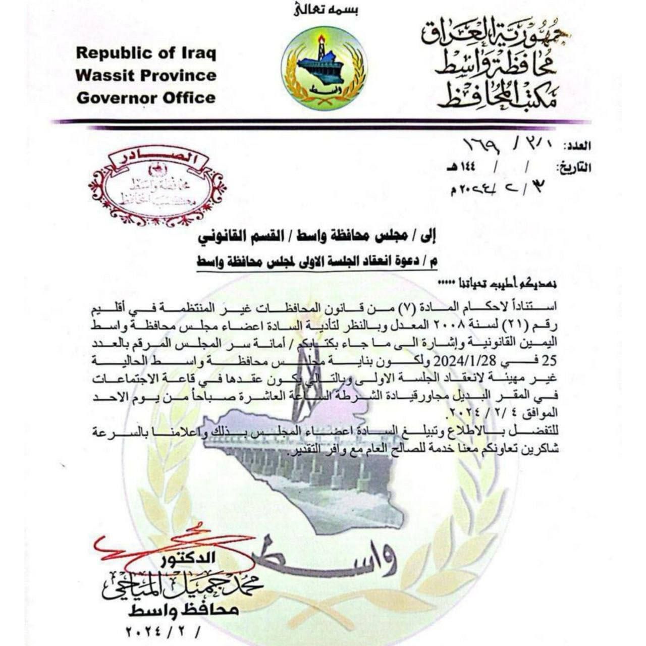 الرئيسية/أخبار العراق/بالوثيقة محافظ واسط يدعو أعضاء مجلس المحافظة لعقد الجلسة الأولى يوم غد الاحد أخبار العراق بالوثيقة محافظ واسط يدعو أعضاء مجلس المحافظة لعقد الجلسة الأولى يوم غد الاحد شباط 3, 2024, 8:44 م فيسبوك X لينكدإن Tumblr بينتيريست Reddit VKontakte Odnoklassniki Pocket نسخ الرابط تم نسخ الرابط شباط 3, 2024, 8:44 م فيسبوك X لينكدإن Tumblr بينتيريست Reddit VKontakte Odnoklassniki Pocket شاركها فيسبوك X لينكدإن Tumblr بينتيريست Reddit VKontakte Odnoklassniki Pocket مشاركة عبر البريد طباعة