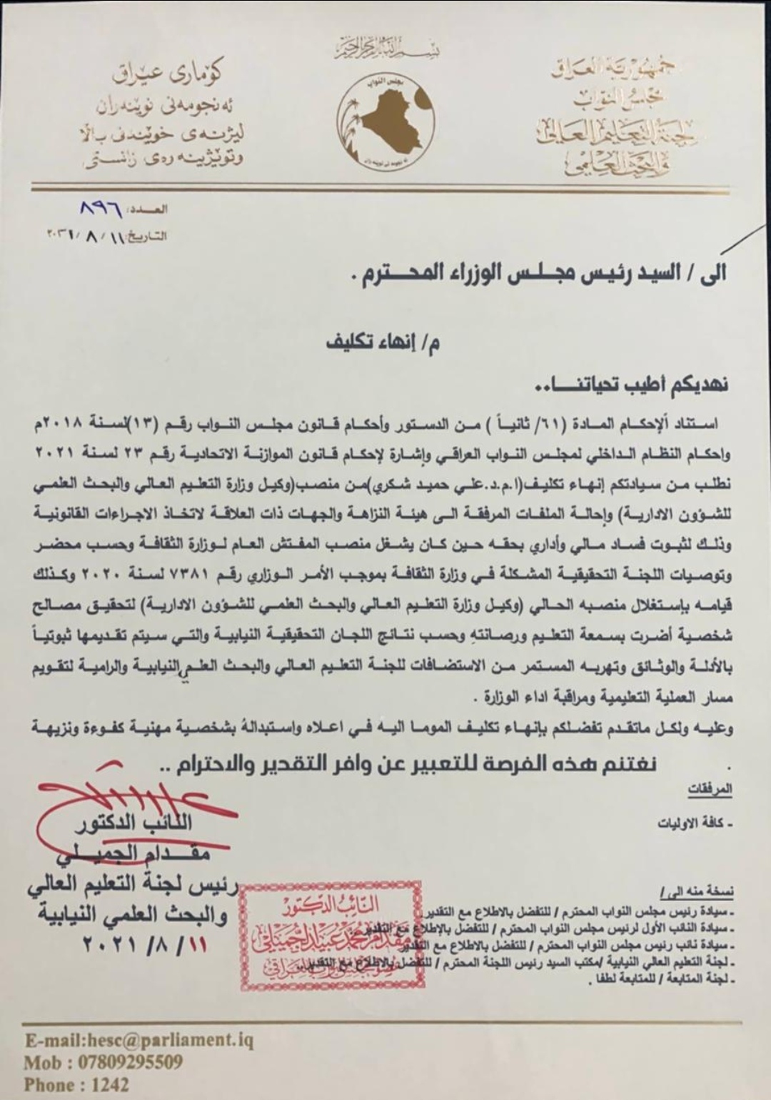 طالب رئيس اللجنة النيابية للتعليم العالي النائب الدكتور مقداد الجميلي بكتاب رسمي إلى رئيس مجلس الوزراء بأنهاء تكليف الدكتور علي حميد شكري من منصب وكيل وزير التعليم العالي والبحث العلمي للشؤون الإدارية واستبداله بشخصية كفوءة ونزيهة وذلك لثبوت فساد إداري ومالي بحقه وإحالة الملفات إلى هيئة النزاهة والجهات ذات العلاقة.