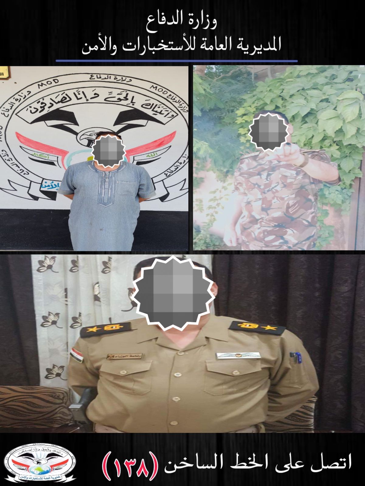 ضمن سلسلة الواجبات النوعية التي تنفذها المديرية العامة للاستخبارات والامن بوزارة الدفاع بملاحقة العناصر المطلوبة والخارجة عن القانون وبالأعتماد على المعلومات الاستخبارية وبعد استحصال الموافقات القضائية الأصلية، تمكنت مفارز مديرية استخبارات وامن كركوك التابعة الى المديرية من القاء القبض على شخص ينتحل صفة ضابط برتبة (مقدم) في إحدى الأجهزة الأمنية ، حيث كان يقوم بابتزاز المواطنين مقابل مبالغ مالية، جرت العملية في مركز مدينة كركوك بالتنسيق مع فوج مغاوير قيادة المقر المتقدم للعمليات المشتركة – كركوك، تم اتخاذ الاجراءات القانونية بحقه واحالة الى الجهات القضائية المختصة.