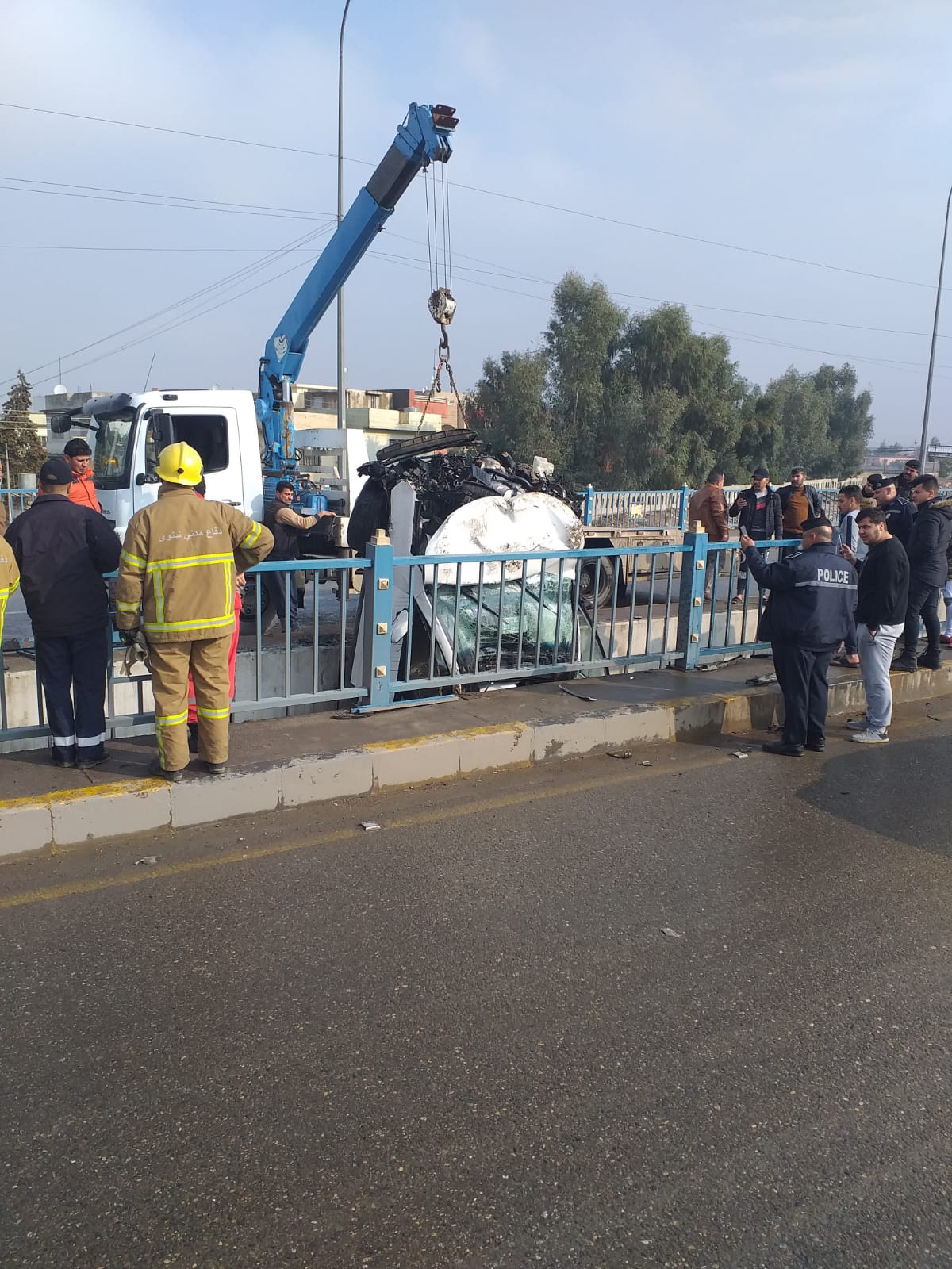 تمكنت فرق انقاذ الدفاع المدني من التعامل مع عجلة مدنية اصطدمت بسياج جسر سنحاريب الحديدي في ايسر الموصل لتهوي ساقطة من أعلاه الى الأرض لتتسارع فرق انقاذ الدفاع المدني لموقع الحادث .