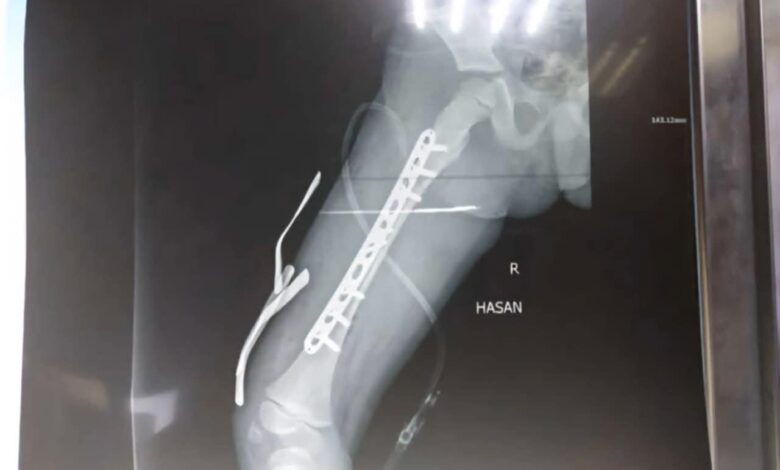 اخصائي جراحة العظام والكسور الدكتور اشرف الحسيني بين ان المريض يعاني من تشوه الفخذ الأيمن نتيجة الكسر حيث اجريت له عملية تثبيت كسر عظم الفخذ الايمن عبر استخدام الصفيحة المغلقة مع البراغي ، مؤكداً نجاح العملية واستقرار الحالة الصحية للمريض بجهود الكادر الطبي والتمريضي والصحي والتخدير في صالة العمليات .