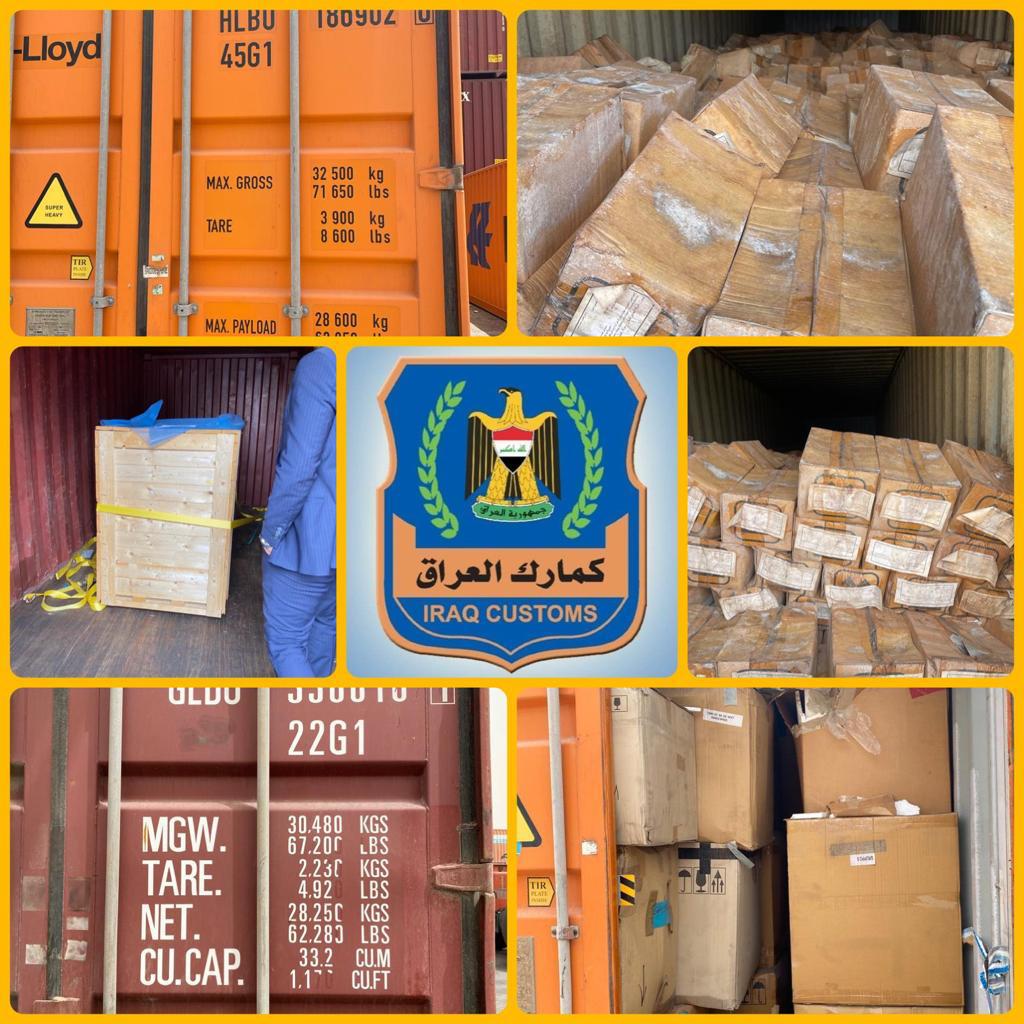 تنفيذاً لتوجيهات مدير عام الهيئة العامة للكمارك الحقوقي الاستاذ شاكر محمود الزبيدي بتفعيل دور اقسام التحري و مكافحة التهريب في كافة المناطق الكمركيه ، تمكن قسم التحري و مكافحة التهريب في مديرية كمرك المنطقة الجنوبية و بتعاون مع ادارة كمرك ام قصر الشمالي و اسناد شرطة الكمارك بضبط خمسة حاويات معدة للتهريب و مخالفة للشروط و الضوابط الاستيرادية محملة ( معسل اركيلة و فلاتر و هوز ماء و مضخات كهربائية و اثاث مكتبي ) .