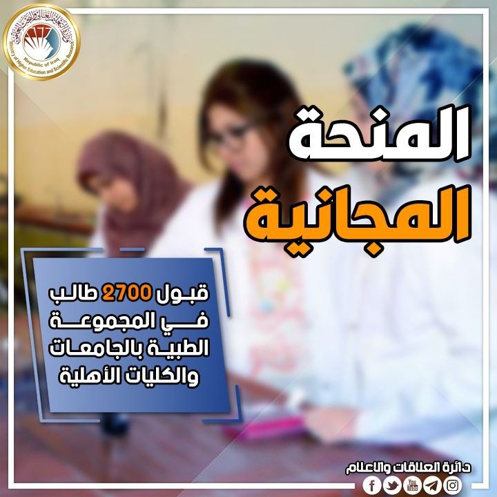 تعلن وزارة التعليم العالي والبحث العلمي قبول ألفين وسبعمئة طالب ضمن المنحة المجانية الخاص بالمجموعة الطبية (طب، طب أسنان، الصيدلة) في الجامعات والكليات الأهلية للعام الدراسي 2022/2021.