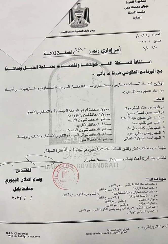 وسام أصلان يصدر جملة من الإعفاءات بعد يومين من توليه إدارة محافظة بابل