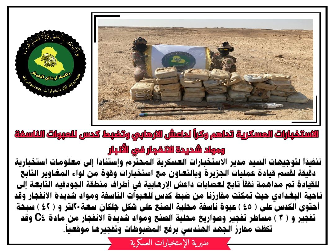 الاستخبارات العسكرية تضبط وكراً لداعش الارهابي بداخله كدس للعبوات الناسفة ومواد شديدة الانفجار في الأنبار