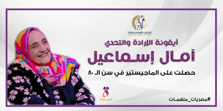 وصف المجلس القومي للمرأة السيدة ” آمال اسماعيل ” صاحبة رسالة الماجستير في عُمر الـ 80 بايقونة الارادة والتحدي حيث تركت المدرسة وعمرها لا يتجاوز الـ12 عاما؛ لتحقق رغبة أسرتها فى الزواج. قررت أن تتشبث بحلمها وتكمل تعليمها الأساسي.