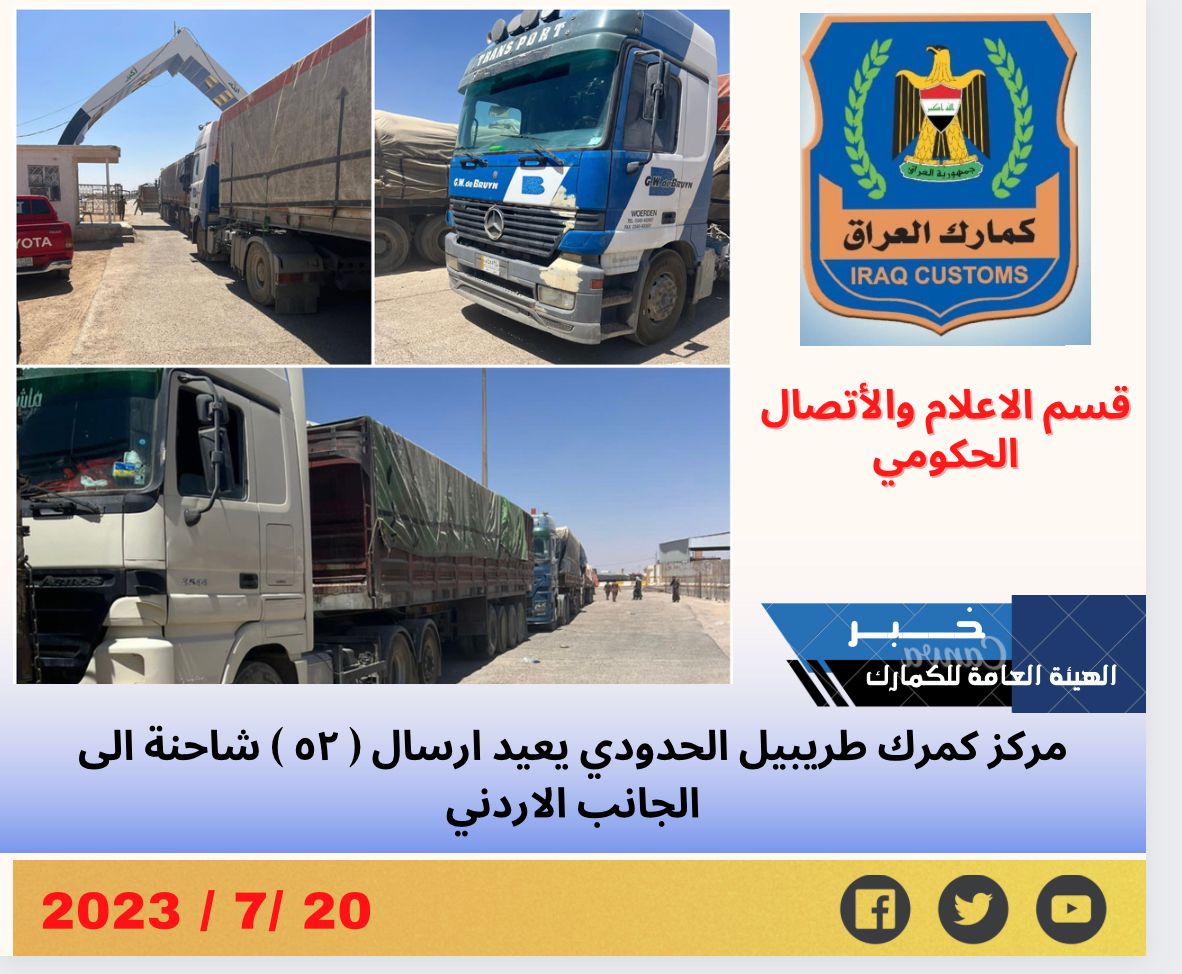 اعلنت الهيئة العامة للكمارك اليوم الخميس المصادف ٢٠ تموز ٢٠٢٣ عن قيام مركز كمرك طريبيل الحدودي باعادة ( ٥٢ ) شاحنة محملة ( سماد داب ) الى الجانب الاردني و ذلك لعدم مطابقتها فحص الجهاز المركزي للتقييس و السيطرة النوعية.