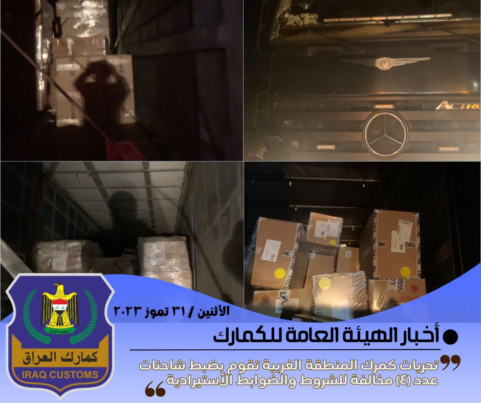 الهيئة العامة للكمارك تعلن اليوم الأثنين المصادف ( ٣١-٧-٢٠٢٣) عن قيام قسم التحري ومكافحة التهريب في مديرية كمرك المنطقة الغربية في سيطرة مفرق الثرثار بضبط شاحنات عدد (٤) محملة (اصباغ ، مواد منزلية ، صحيات ، ملابس مختلفة )ومواد متنوعة اخرى مخالفة للشروط والضوابط الاستيرادية النافذة .