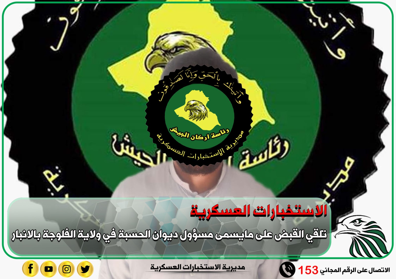 بعملية نوعية وجهد استخباري مميز لشعبة الفرقة العاشرة التابعة إلى مديرية الاستخبارات العسكرية وبالتعاون مع قوة من اللواء الثامن والثلاثين تم نصب كمين محكم في سيطرة الشهيد احمد الصداك وعلى أثره ألقي القبض على مايسمى مسؤول ديوان الحسبة في ولاية الفلوجة والذي شارك بالعديد من العمليات الارهابية ضد القوات الأمنية في الانبار وهو مطلوب وفق أحكام المادة 4 إرهاب وقد تم تسليمه إلى جهة الطلب ميدانياً وأصولياً.