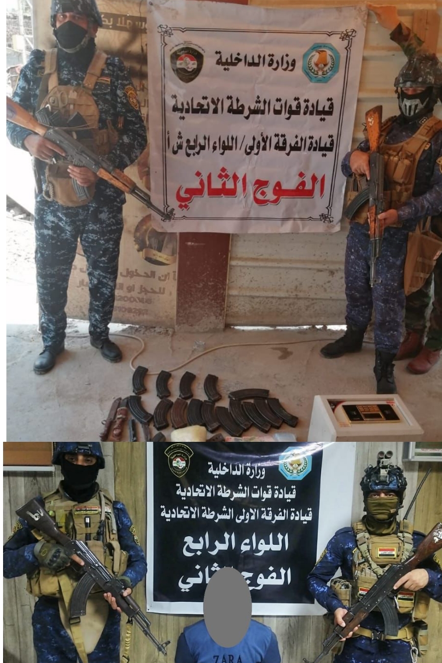 تمكنت قوة من اللواء الرابع الفرقة الاولى بالاشتراك مع مفرزة من استخبارات اللواء من إلقاء القبض على احد المتاجرين بالمخدرات في منطقة (الزعفرانية) وضُبِطَت بحوزته (1)كغم من مادة الكرستال المخدرة ، (6) ميزان إلكتروني ، بايب تعاطي ، اكياس تعبئة ، (15) مخزن بندقية كلاشنكوف ، (3) مسدس ، قاصة مغلقة ، مبلغ مالي قدره (4.570.000)اربعة ملايين وخمسمائة وسبعون الف دينار عراقي ،