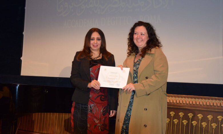 رانيا يحيى تهدى شهادات تقدير للمشاركين فى فعاليات الاكاديمية المصرية بروما