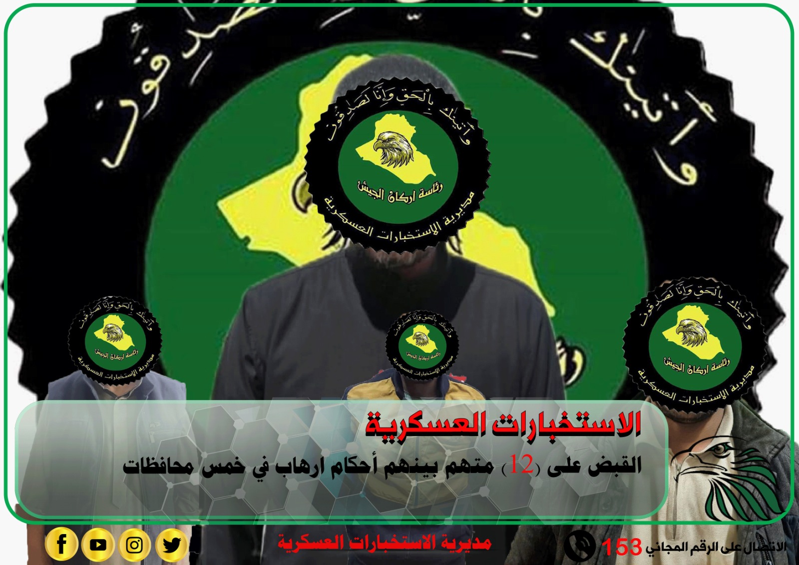 الاستخبارات العسكرية:القبض على 12 متهما بينهم متهمين بقضايا إرهابية في خمس محافظات