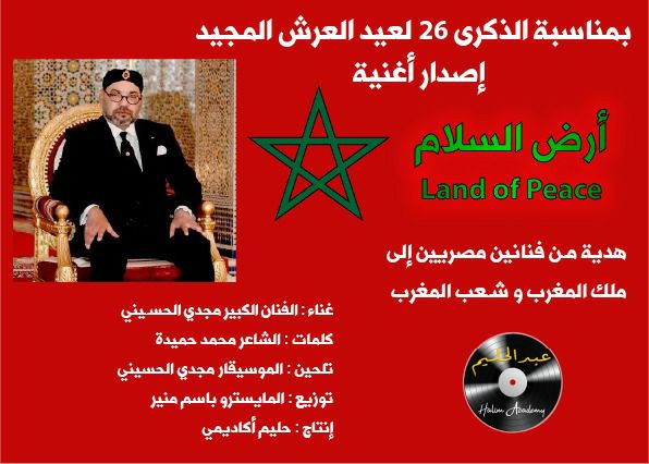 تقدم أكاديمية حليم أغنية جديدة مهداة من الموسيقار الكبير مجدي الحسيني والشاعر المصري محمد حميدة . وقد أعلنت ” أكاديمية حليم” بالمغرب، عن إنتاج أغنية جديدة تحت عنوان: أرض السلام، وهي” إهداء من شاعر وملحن مصريين” بمناسبة الذكرى السادسة والعشرون لتربع الملك محمد السادس على عرش أسلافه المنعمين.