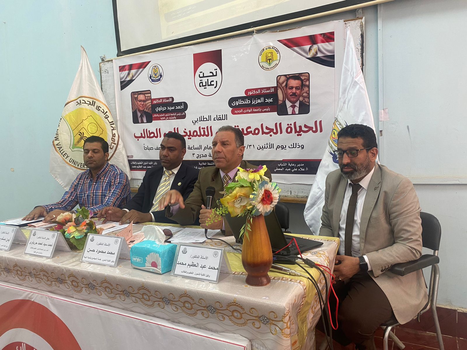 نظمت كلية التربية الرياضية بجامعة الوادى الجديد اللقاء الطلابى لطلاب الفرقة الأولى بعنوان ( الحياة الجامعية من التلميذ إلى الطالب ) تحت رعاية الأستاذ الدكتور عبد العزيز طنطاوى رئيس جامعة الوادى الجديد والأستاذ أحمد سيد حرباوى نائب رئيس الجامعة لشئون التعليم والطلاب والمشرف على كلية التربية الرياضية وبحضور السادة وكلاء كلية التربية الرياضية لشئون التعليم والطلاب وشئون خدمة المجتمع وتنمية البيئة وشئون الدراسات العليا والبحوث ومنسق الأنشطة بالكلية وأعضاء هيئة التدريس والهيئة المعاونة والطلاب
