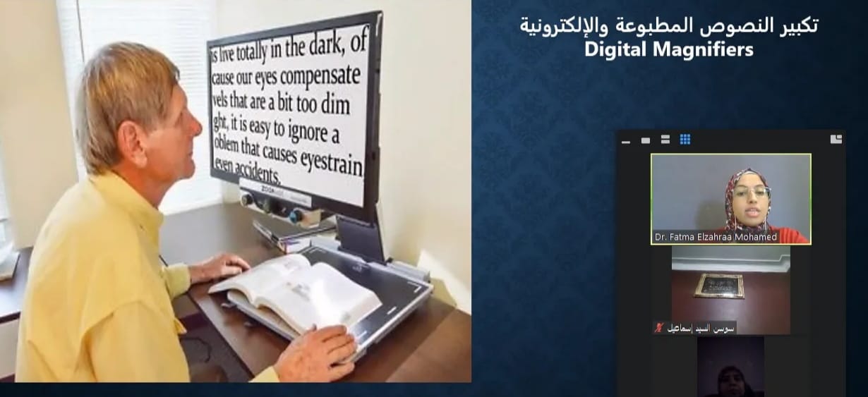 حيث سلطت صباح اليوم الدكتورة فاطمة الزهراء محمد عبده المنتمية للإدارة العامة للتمكين الثقافي بهيئة قصور الثقافة الضوء علي محاضرة اليوم حول التكنولوجيا المساعدة للإعاقة البصرية مؤكدةً على ان التكنولوجيا بالنسبة لهم لم تعد رفاهية وإنما نهجا ًلابد من انتهاجه لتوحيد الرؤى لإتاحة الفرص لهم في تمكينهم من المشاركة الكاملة في الحياة الاجتماعية والاقتصادية لمجتمعاتهم وتطوير قدراتهم لتحسين حياتهم ودمجهم في المجتمع فيتحقق الازدهار وتحدث ثورة في الحياة بالعديد من الجوانب ويكون لهم أداءً أكاديمياً أفضل يسهل دمجهم في مختلف الانشطة لتحسين تواصلهم مع الاخرين ويكون لهم حياة اجتماعية اكثر انخراطاً مما يترتب علية تعزيز الثقة بالنفس ويزيد من الاستقلال والاكتفاء الذاتي.