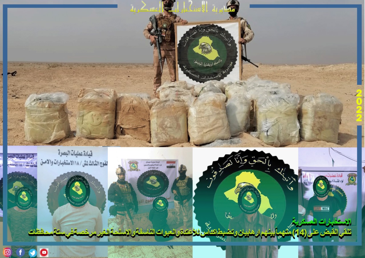 الاستخبارات العسكرية تلقي القبض على( 14 ) متهماً بقضايا متنوعة وتضبط اكداس للأعتدة والعبوات الناسفة والاسلحة الغير مرخصة في مناطق متفرقة