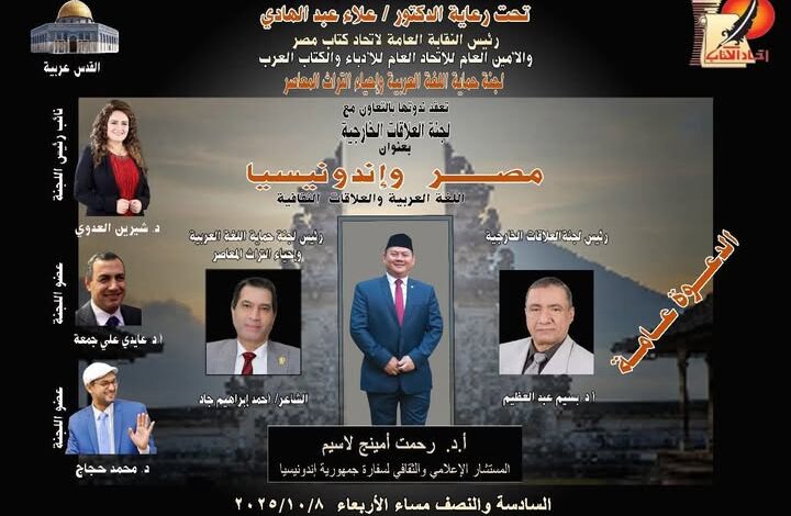 تحت رعاية معالي الأستاذ الدكتور.. علاء عبد الهادي رئيس النقابة العامة لاتحاد كتاب مصر والأمين العام للاتحاد العام للأدباء والكتاب العرب تعقد لجنة حماية اللغة العربية وإحياء التراث المعاصر برئاسة الشاعر ..أحمد إبراهيم جاد. ونائب رئيس اللجنة الدكتورة شيرين العدوي ندوتها بالتعاون مع لجنة العلاقات الخارجية برئاسة د بسيم عبد العظيم بعنوان ..مصر وإندونيسيا . اللغة العربية والعلاقات الثقافية ضيف الندوة ..الدكتور ..رحمت أمينج لاسيم ..المستشار الإعلامي والثقافي لجمهورية إندونيسيا بالقاهرة . وذلك يوم الأربعاء القادم الموافق 8 أكتوبر 2025 في تمام السادسة والنصف مساء .