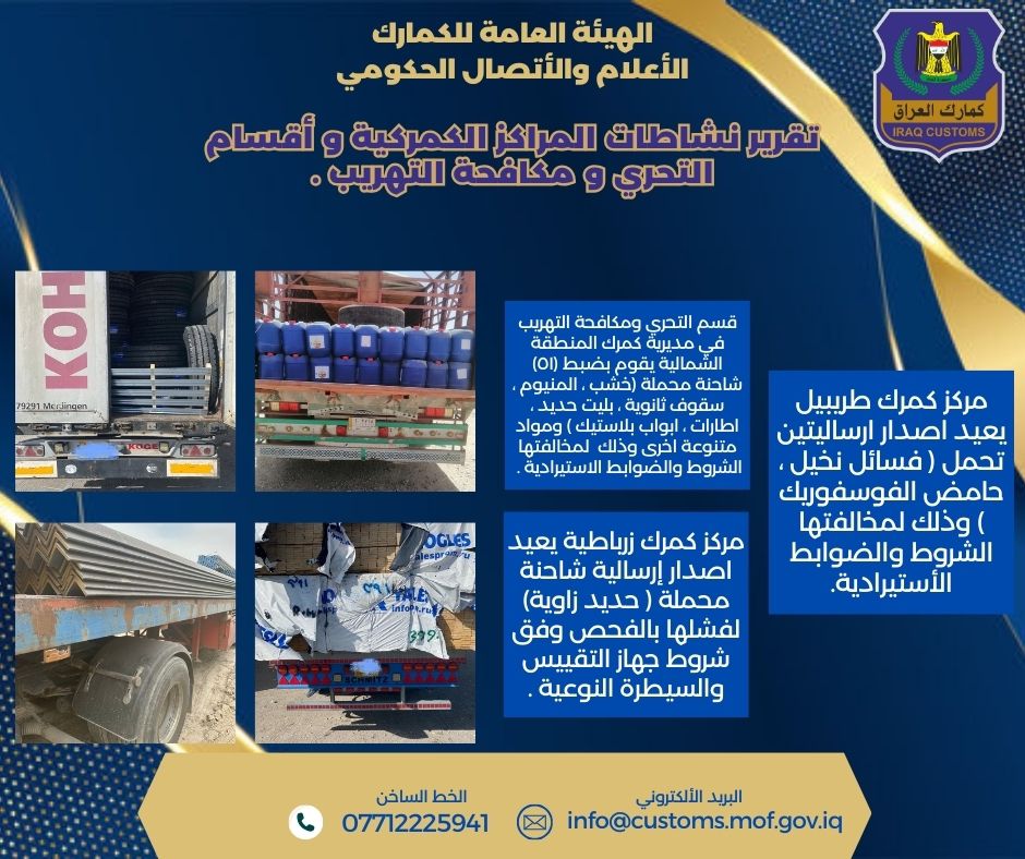 مركز كمرك طريبيل يعيد اصدار ارساليتين تحمل ( فسائل نخيل ، حامض الفوسفوريك ) وذلك لمخالفتها الشروط والضوابط الأستيرادية.