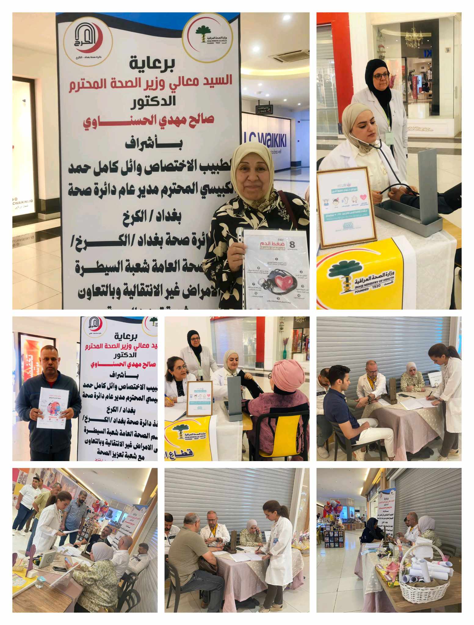 تواصل الملاكات الطبية والصحية التابعة لقطاعات الرعاية الصحية الاولية التابعة لدائرة صحة بغداد الكرخ لليوم الثاني بحملة الكشف المبكر والتحري عن مرض ارتفاع الضغط والسكري في مولات (الحارثي ، المنصور ، بابلون) تنفيذا لتوجيهات وزارة الصحة وبدعم من معالي وزير الصحة الاستاذ الدكتور صالح الحسناوي وبأشراف مدير عام دائرة صحة بغداد الكرخ الدكتور وائل كامل حمد الكبيسي