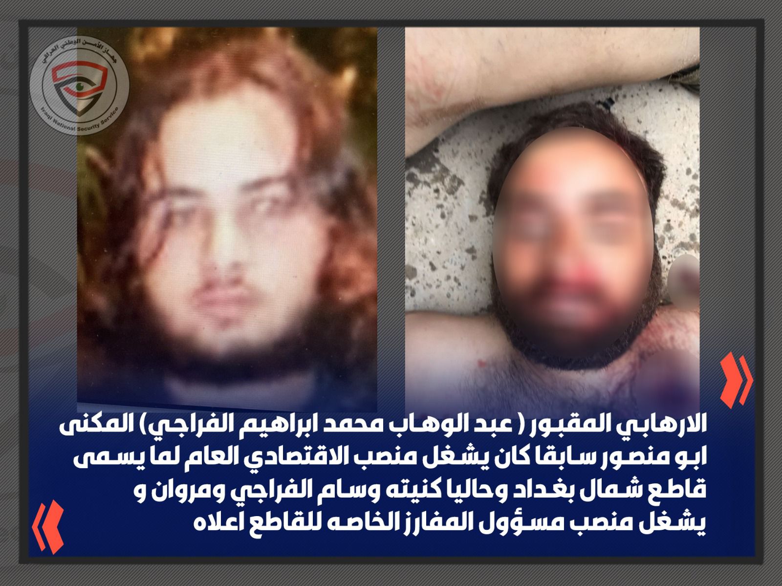 كشف جهاز الأمن الوطني عن هويات قتلى عصابات داعش الإرهابي الذين تم قتلهما في العملية الأمنية التي نُفذت اليوم في قضاء الطارمية وهما كل من: