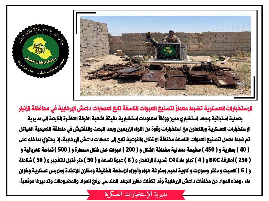 الاستخبارات العسكرية تضبط معملاً لتصنيع العبوات الناسفة تابع لعصابات داعش الإرهابية في محافظة الأنبار