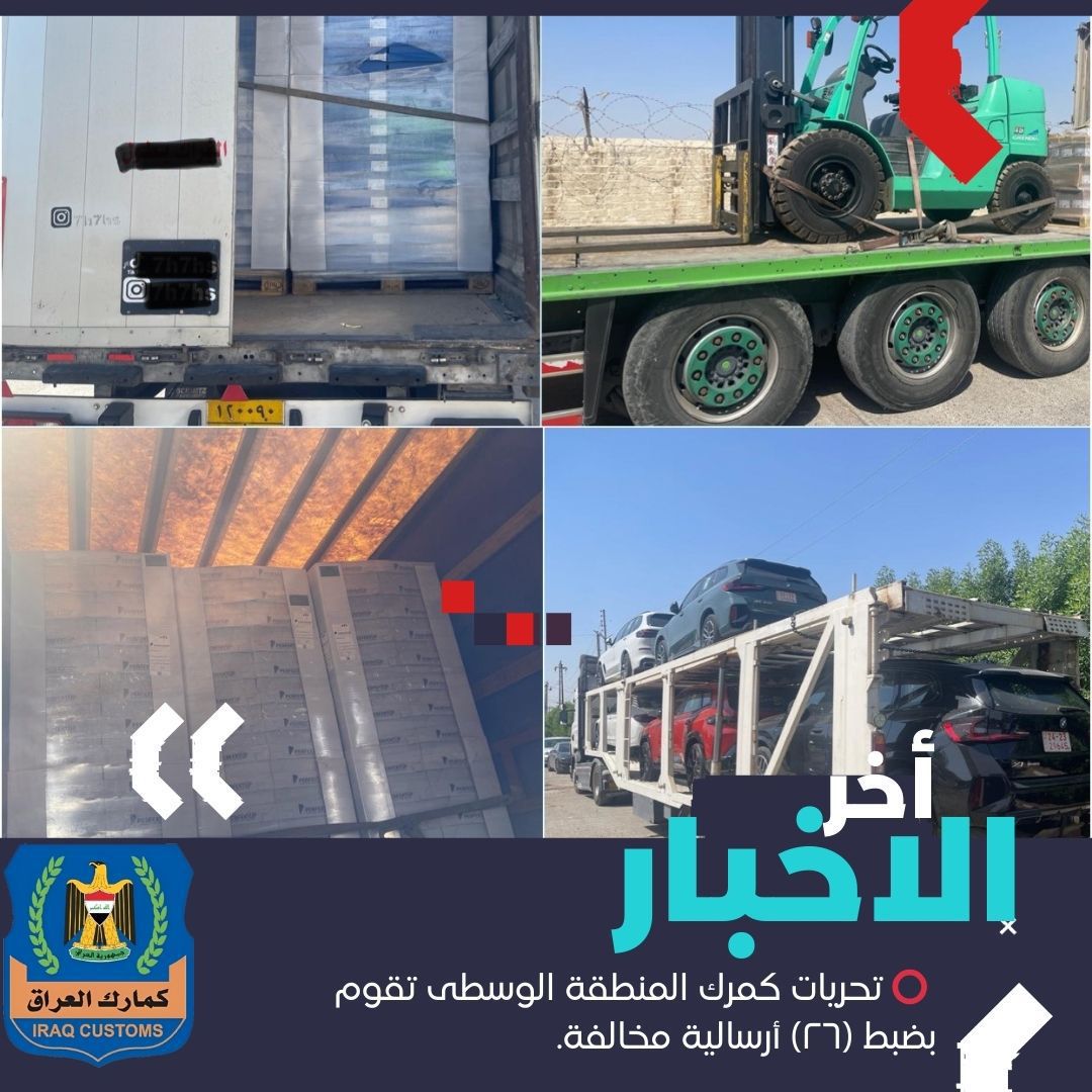 تحريات كمرك المنطقة الوسطى تقوم بضبط (٢٦) شاحنة مخالفة.