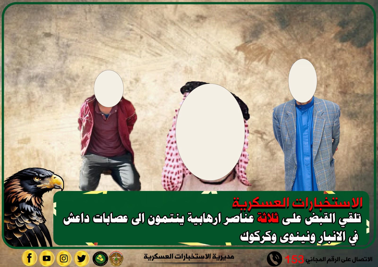 الاستخبارات العسكرية تلقي القبض على ثلاثة عناصر ارهابية من عصابات داعش في الأنبار ونينوى وكركوك