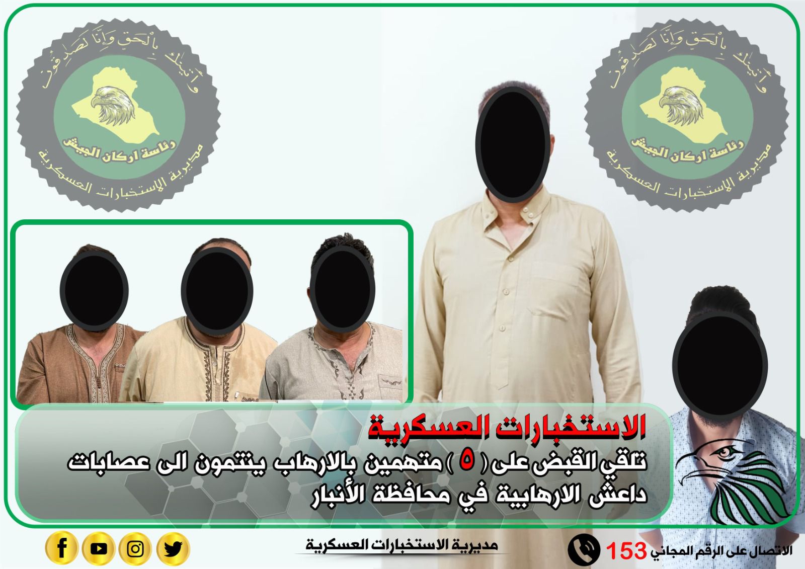 الاستخبارات العسكرية تلقي القبض على ( ٥ ) متهمين بالارهاب ينتمون لعصابات داعش في الأنبار