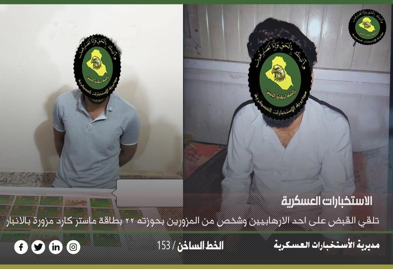 وفي ذات السياق تمكنت القوات من القاء القبض على شخص يمتهن التزوير وتضبط بحوزته ٢٢ ماستركارد مزور في الانبار حيث تم احالته للجهات المعنية لاتخاذ الاجراءات القانونية بحقه.