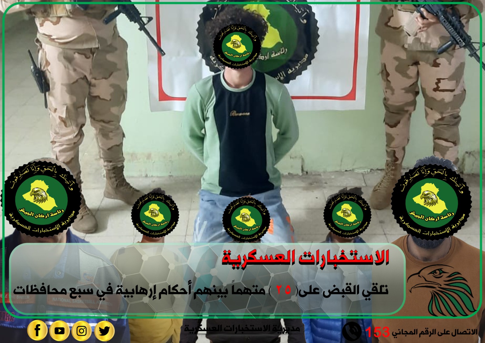 الاستخبارات العسكرية تلقي القبض على( 25 ) متهماً بينهم أحكام إرهابية في سبع محافظات