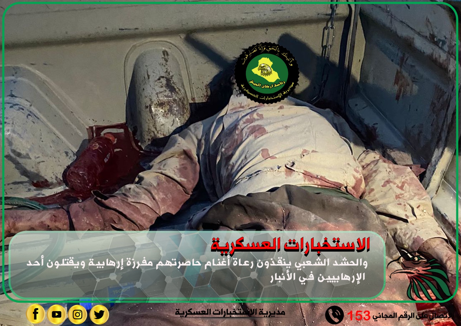بواجب مشترك ووفقا لمعلومات استخبارية دقيقة لشعبة الفرقة الخامسة التابعة إلى مديرية الاستخبارات العسكرية وبالتعاون مع قوة من الحشد الشعبي اللواء السابع عشر تم فك الحصار عن رعاة أغنام حاصرتهم مفرزة إرهابية، كما تمكنت من قتل أحد عناصرها ما يسمى (أبو مجاهد) التابع إلى مفارز صحراء الشامية بين وادي ملصي والاغري في تقاطع السوداني بقضاء الرطبة بمحافظة الأنبار، وقد تم مرافقة رعاة الأغنام وايصالهم الى مكان آمن، كما شرعت القوة المنفذة للواجب بعملية تفتيش بحثا عن بقية العناصر الإرهابية الذين لاذوا بالفرار…