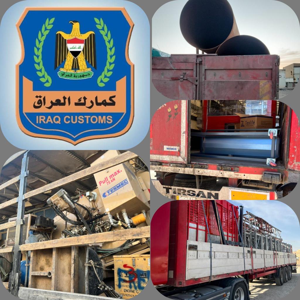 في كمرك المنطقة الشمالية بضبط (٤) شاحنات محملة بمواد (ماكنة غسل المفروشات ومصاعد الاشخاص والبضائع وماكنة أسلاك وأنابيب حديد )