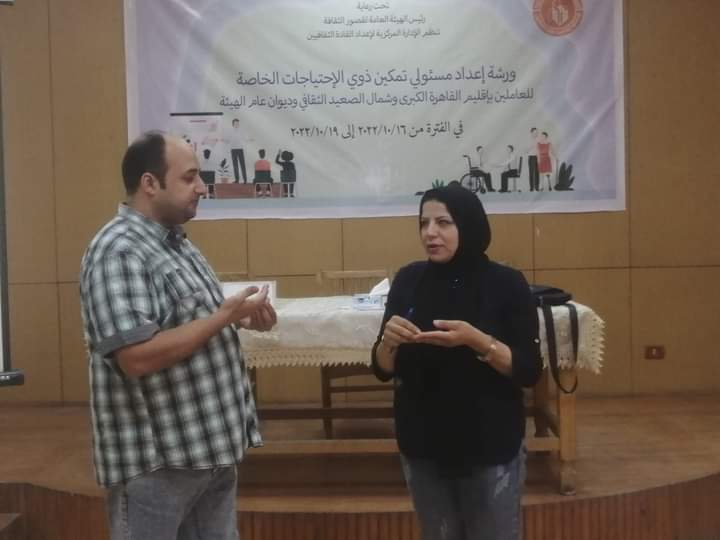 حول مشكلات الإعاقة في مصر وأهم المعوقات التي تواجه مقدمي الخدمة الثقافية لذوي الاحتياجات الخاصة استكملت الإدارة المركزية لإعداد القادة الثقافيين برئاسة الدكتورة منال علام فعاليات ورشة ” إعداد مسئولي تمكين ذوي الاحتياجات الخاصة “