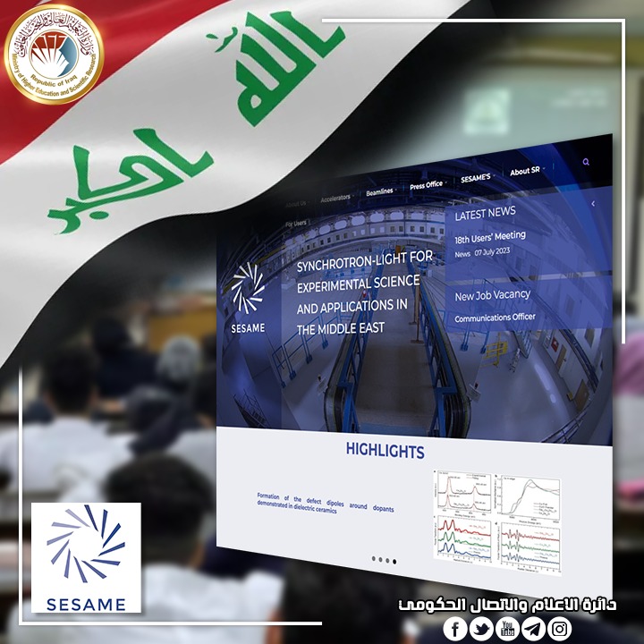 تعلن وزارة التعليم العالي والبحث العلمي انضمام العراق رسميا الى مجلس السنكروتون للعلوم التجريبية والتطبيقات في الشرق الأوسط (SESAME) المتخصص في البحث العلمي المتقدم والمتميز.