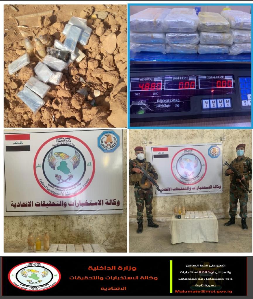 بناءً على معلومات استخباراتية دقيقة تفيد بوجود اشخاص يقومون بالمتاجرة بالمواد المخدرة في محافظة الانبار ، تمكنت وكالة الاستخبارات والتحقيقات الاتحادية في وزارة الداخلية من ضبط هذه المواد المخدرة والتي كانت مخبأة تحت الأرض في منطقة ارميلة بقضاء الرطبة في محافظة الأنبار .