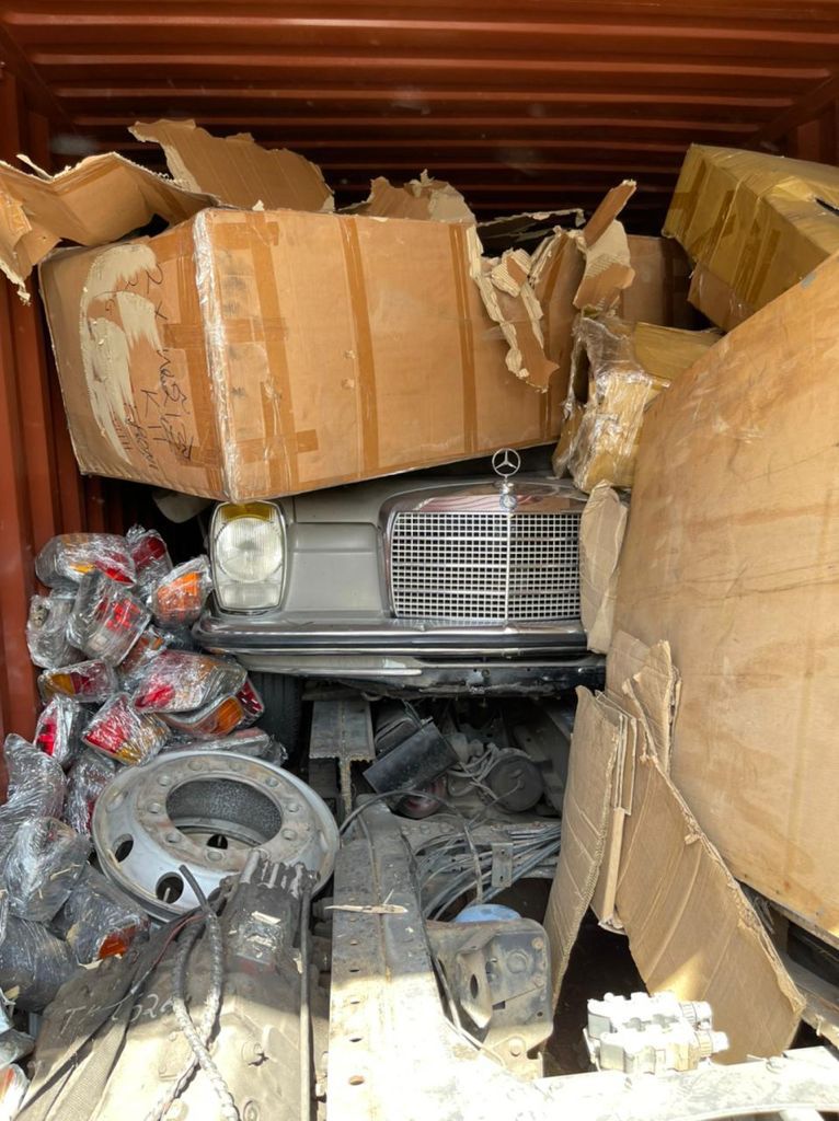 محمله أدوات احتياطيه مخبأ في داخلها عجلات نوع مارسدس عدد (3) موديلات قديمة جداً مخالفة لضوابط الاستيراد.