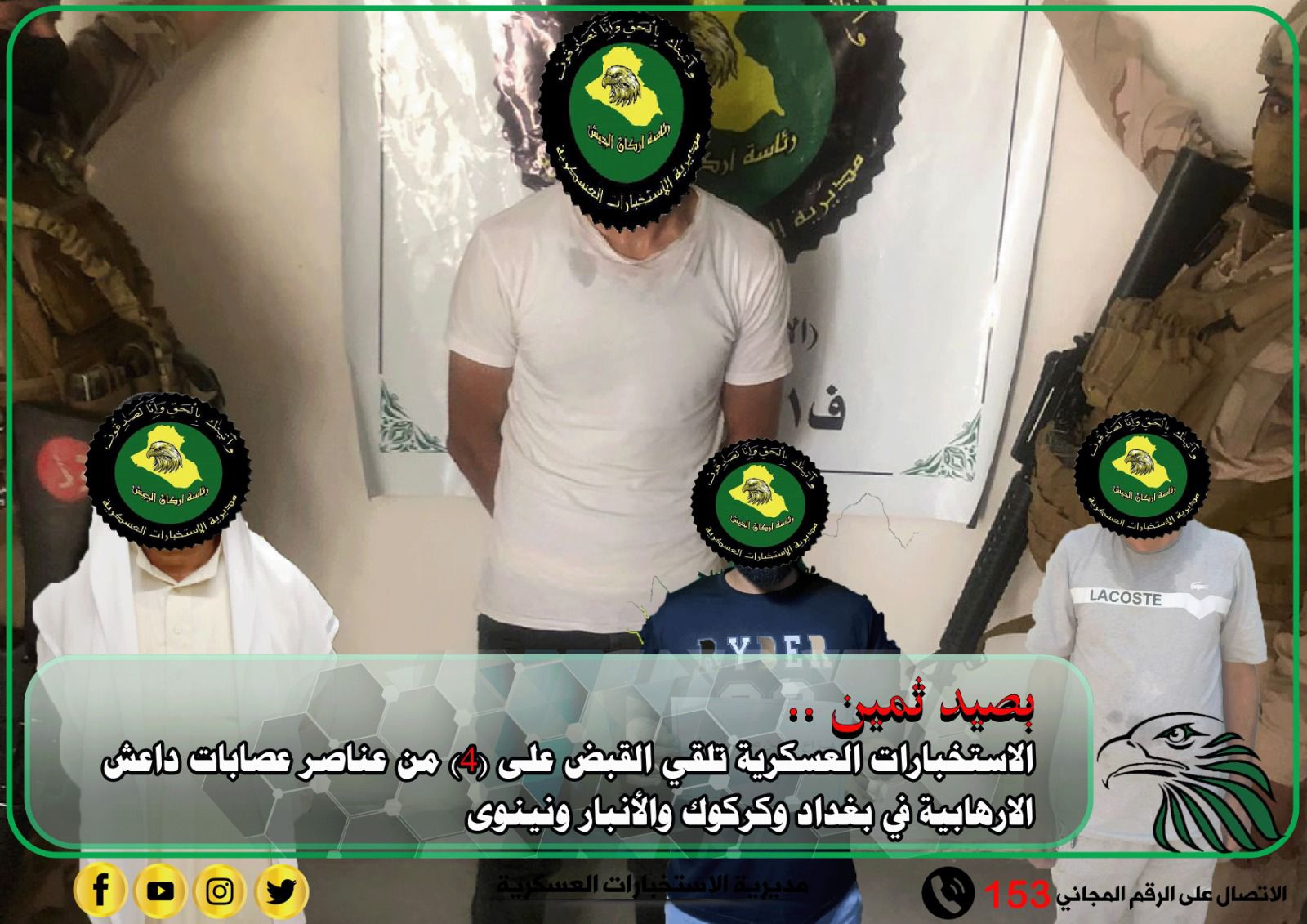 الاستخبارات العسكرية تلقي القبض على ( ٤ ) من عناصر عصابات داعش الارهابية في بغداد وكركوك والانبار ونينوى