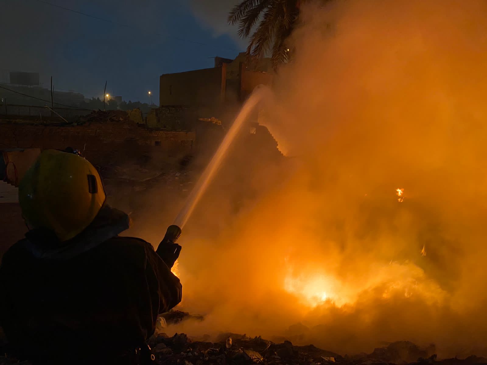 الدفاع المدني يخمد حادث حريق اندلع داخل محلات لتجارة الديكورات وساحة متروكة قرب بنايات سكنية وسط بغداد