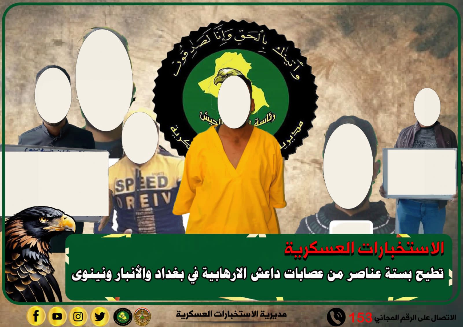 بعمليات نوعية منفصلة نُفذت وفقاً لمعلومات استخبارية دقيقة من قبل شعب قيادات الفرق العاشرة والسادسة عشر والسابعة عشر التابعة إلى مديرية الإستخبارات العسكرية وبالتعاون مع القوات المسلحة المتواجدة في قواطع المسؤولية، ومن خلال كمائن محكمة أسفرت عن إلقاء القبض على ( ٦ ) عناصر من عصابات داعش الإرهابية المطلوبين للقضاء وفق احكام المادة ( ٤ / إرهاب ) في قضائي الرمادي والفلوجة وناحيتي القيارة واللطيفية ، والذين كانوا ينتمون ويعملون مع هذه العصابات الإجرامية في مختلف صفوفها، وقد تم تسليمهم إلى الجهات المعنية بعد اتخاذ الإجراءات القانونية اللازمة بحقهم.