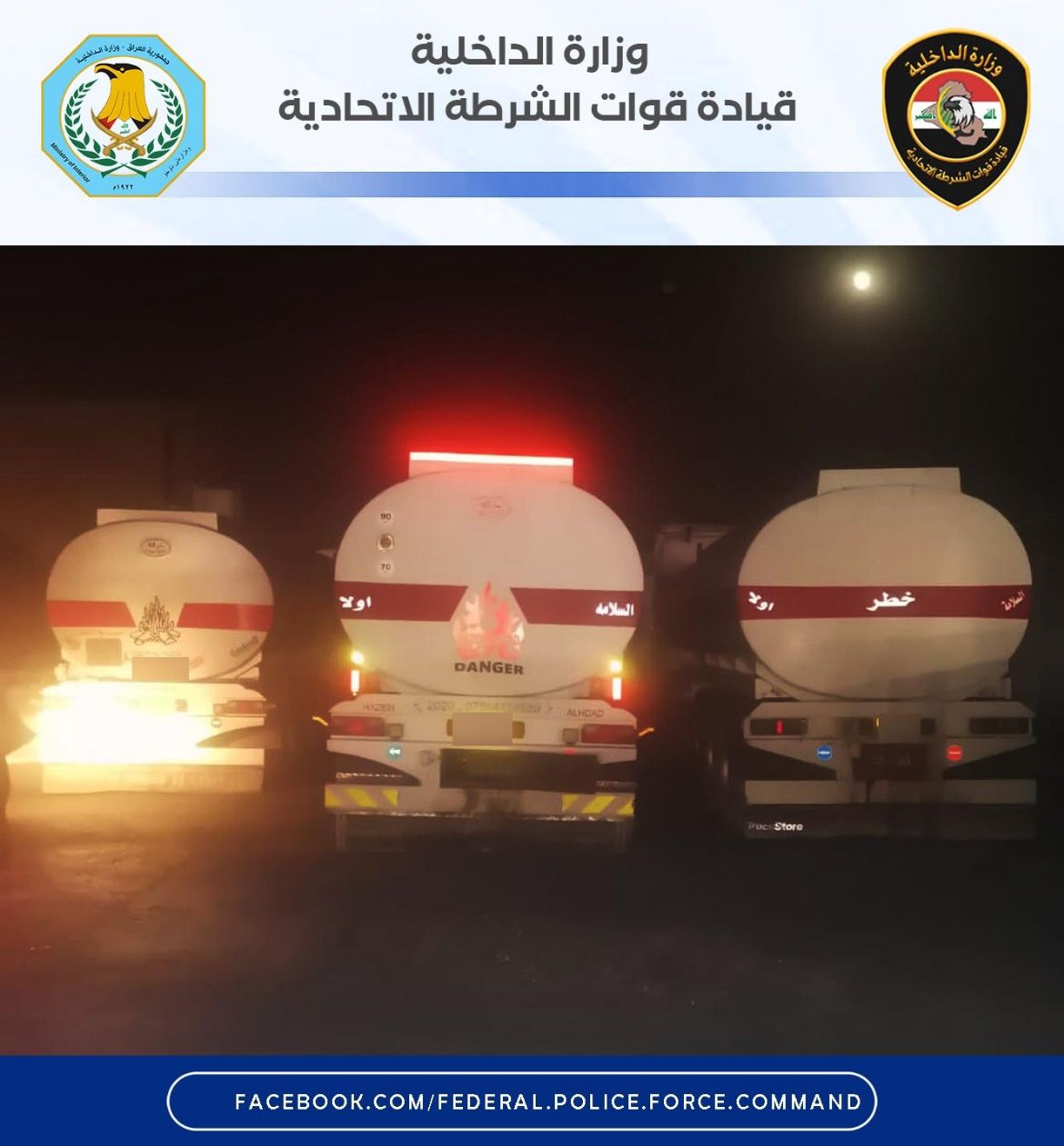 بجهود أمنية متميزة وسرعة في تنفيذ الواجب ، تمكنت قوة من اللواء الرابع الفرقة الأولى شرطة اتحادية بالاشتراك مع مفارز استخبارات اللواء التابعة لوكالة الاستخبارات والتحقيقات ومفرزة من الأمن الوطني من ضبط 3 صهاريج وإلقاء القبض على ‏سائقيها تحمل مادة النفط الأسود معدة للتهريب سعة (٣٦٠٠٠/لتر) بدون أوراق رسمية ‏وثبوتية في منطقة “بسماية” ، ‏