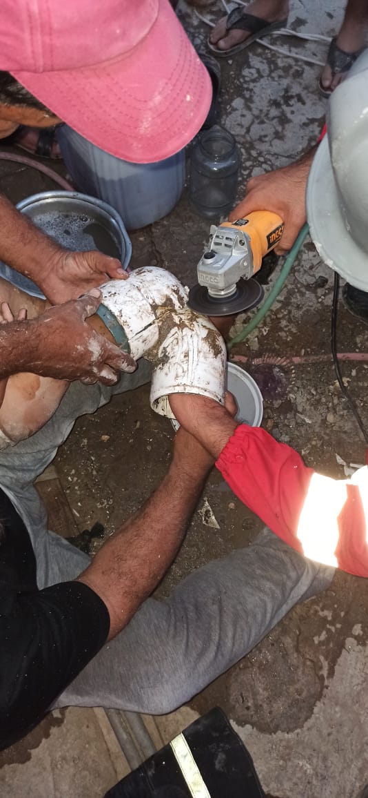 حيث استخدمت فرق انقاذ الدفاع المدني معدات الانقاذ الهيدروليكية لتكسير الارضية الخرسانية واخراج الانبوب الخاص بفتحة المجاري تمهيداً لقصه وتحرير قدم الطفلة مع الحرص الشديد على التعامل بمهنية عالية منعاً بالتسبب بمزيد من الاذى او الكسر لعظم قدم الطفلة الهين الضعيف .