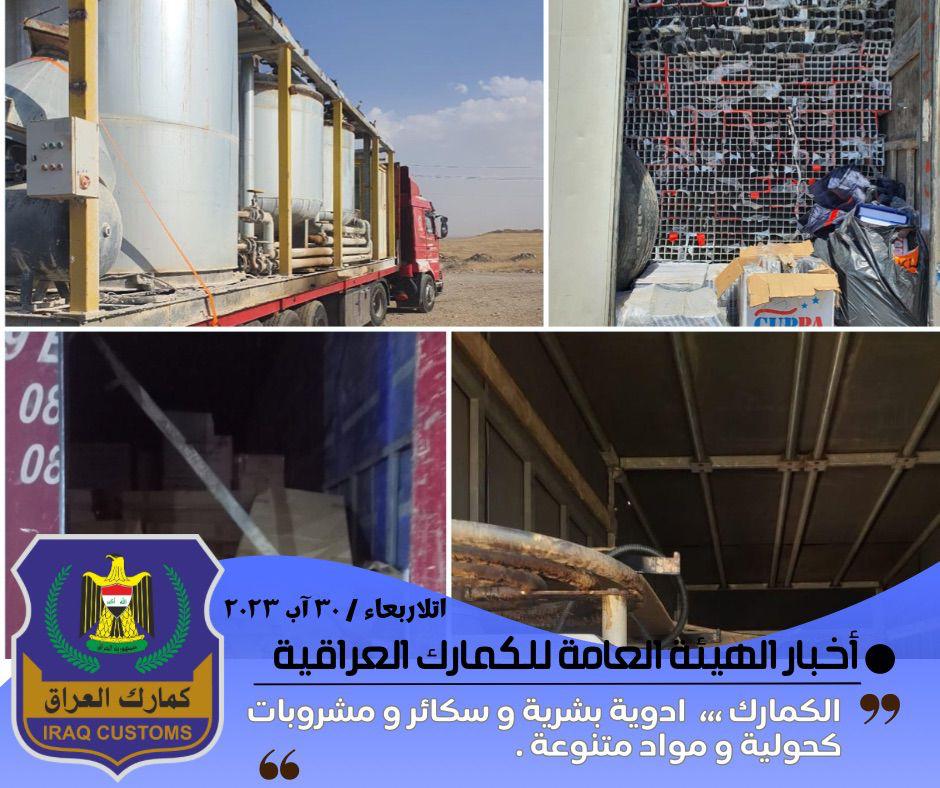 تمكن قسم التحري و مكافحة التهريب في مديرية كمرك المنطقة الشمالية اليوم الاربعاء المصادف ٣٠ أب ٢٠٢٣ من ضبط ( ٤٦ ) شاحنة محملة ( ادوية بشرية ، اجهزة طبية ، سكائر ، مشروبات كحولية ، مواد غذائية متنوعة ، اجهزة هاتف نقال ، معامل ، اجزاء معامل مختلفة ، الآلات و اجهزة كهربائية متنوعة ، كاربونات الكالسيوم ، مواد احتياطية ، اقمشة ، الواح بلاستك ، حديد قوالب ، شيش تسليح ، انابيب حديد ، كريم مرطب ، سقوف ثانوية ، مصاعد ، ماكنة المنيوم ، مرشات زراعية ، لاصق ، معاجين ماستك ) و مواد متنوعة اخرى مخالفة لقانون الكمارك رقم ٢٣ لسنة ١٩٨٤ .