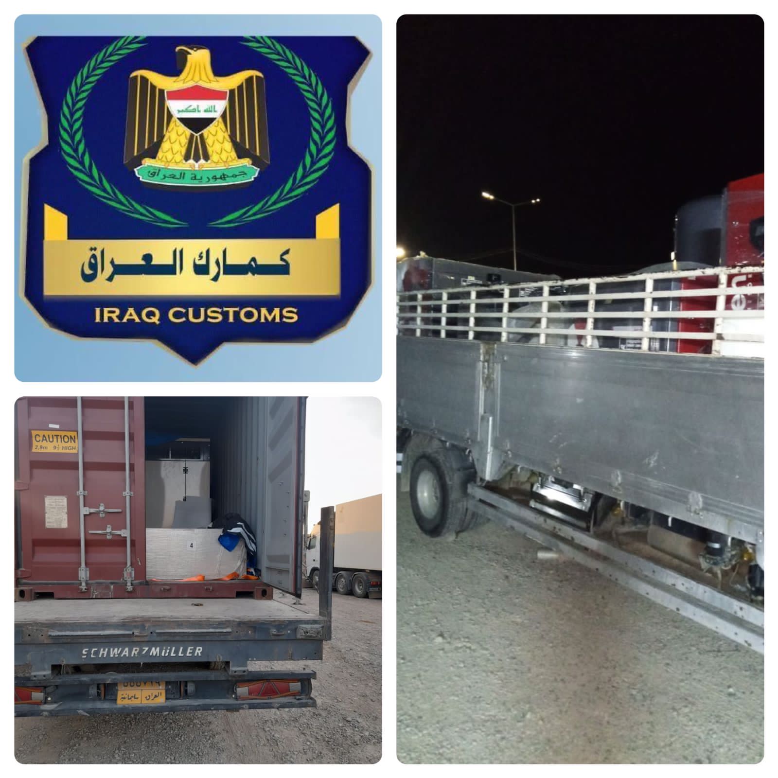 تنفيذاً لتوجيهات مدير عام الهيئة العامة للكمارك الحقوقي الاستاذ شاكر محمود الزبيدي بتفعيل دور اقسام التحري و مكافحة التهريب في كافة المناطق الكمركيه ، قسم التحري و مكافحة التهريب في مديرية كمرك المنطقة الشمالية يضبط ( ٤ ) شاحنات محملة ( مولدات كهربائية و اسمدة زراعية و ضاغطات هواء و اجهزة هاتف نقال ) مخالفة للشروط و الضوابط الاستيرادية.