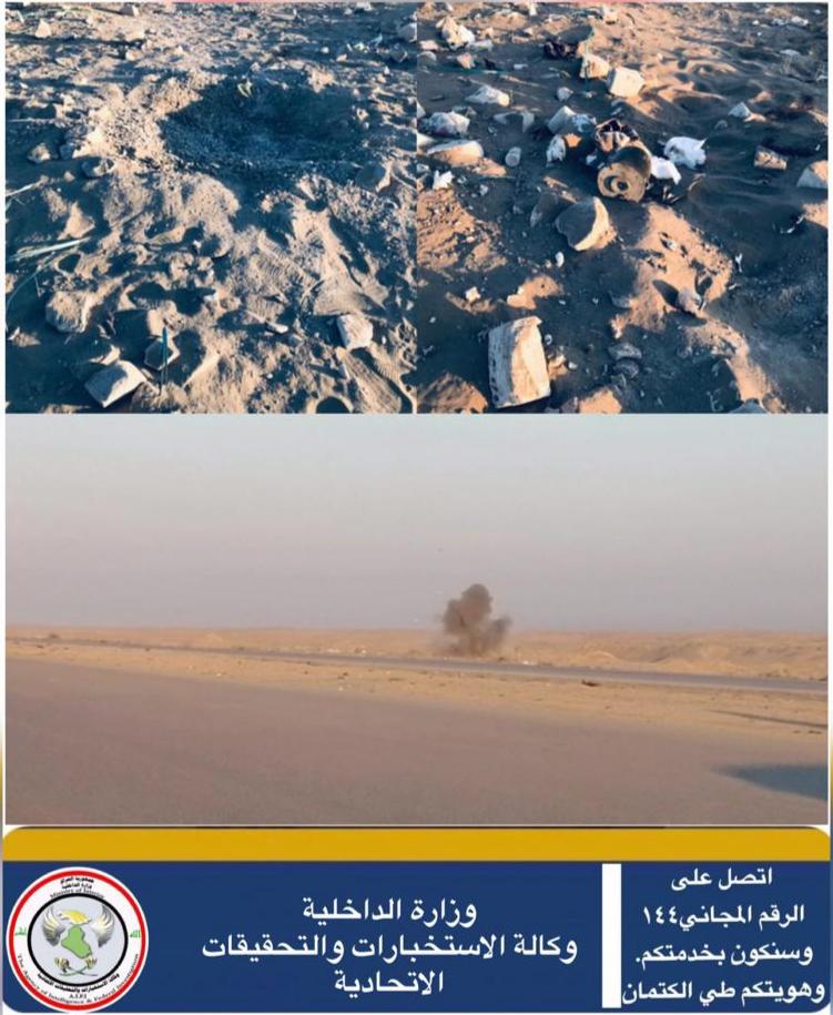 من خلال المتابعة الميدانية وتكثيف الجهود الاستخبارية، تمكنت وكالة الاستخبارات والتحقيقات الاتحادية في وزارة الداخلية بمحافظة المثنى واثناء المسح الميداني المستمر من احباط محاولة استهداف ارتال الدعم اللوجستي بعبوتين ناسفتين مزروعتين على الطريق السريع.