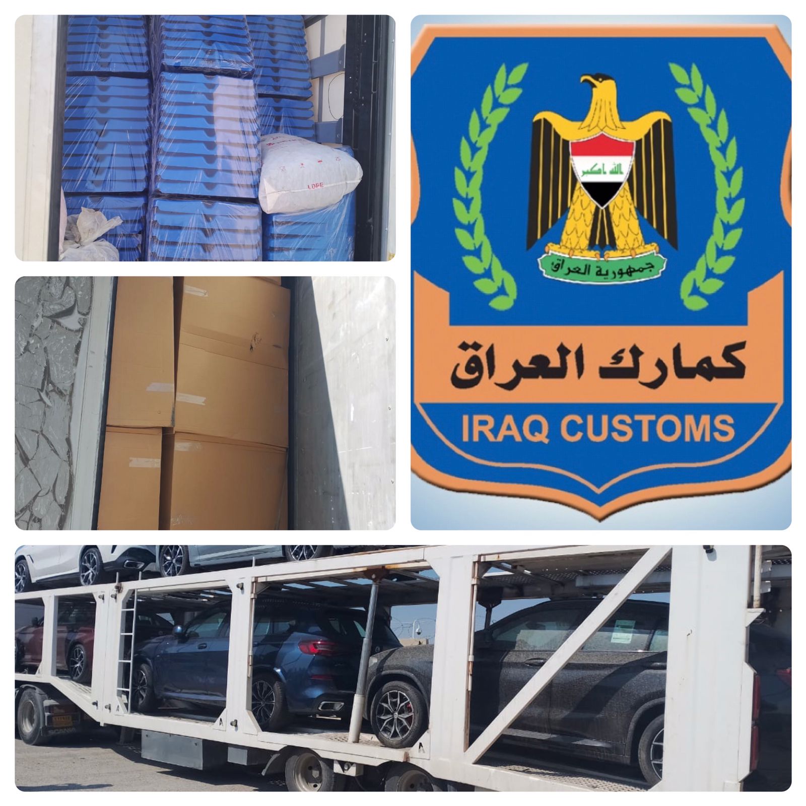 اعلنت الهيئة العامة للكمارك اليوم الاربعاء٢٢/اذار/٢٠٢٣ عن تمكن المفارز الكمركية التابعة لقسم التحري و مكافحة التهريب في مديرية كمرك المنطقة الوسطى من ضبط ( ٧ ) شاحنات مخالفة تحمل ( اثاث ، رول نايلون،سيارات، اثاث بلاستك،سقوف، كرين رافعة) مخالفة للضوابط و التعليمات النافذة.